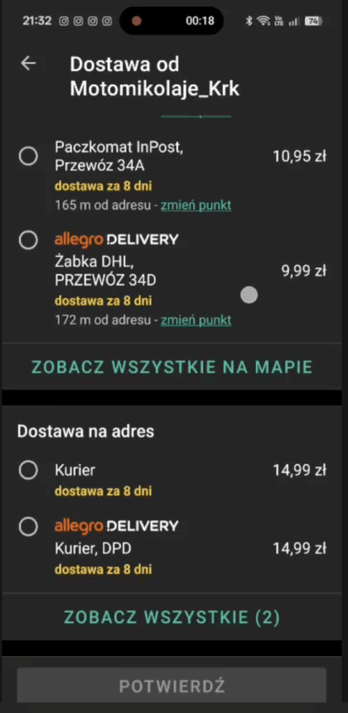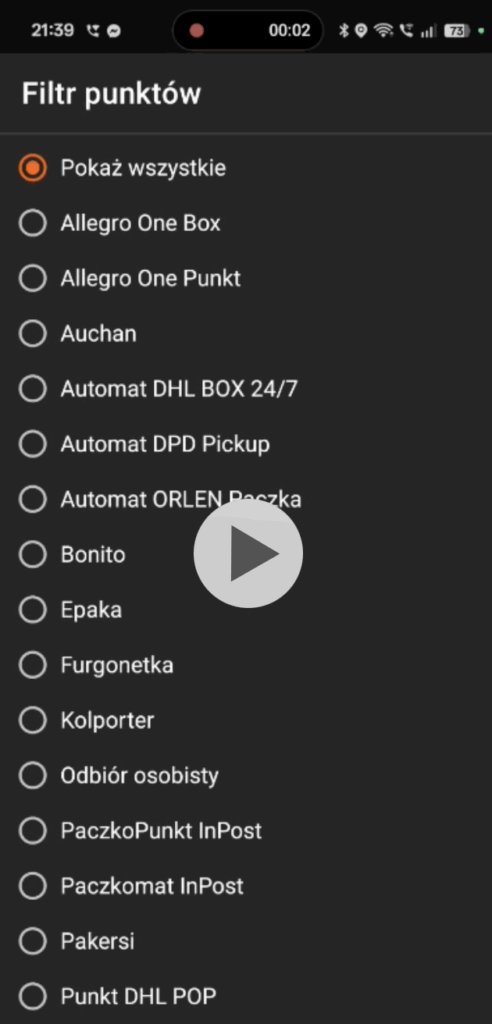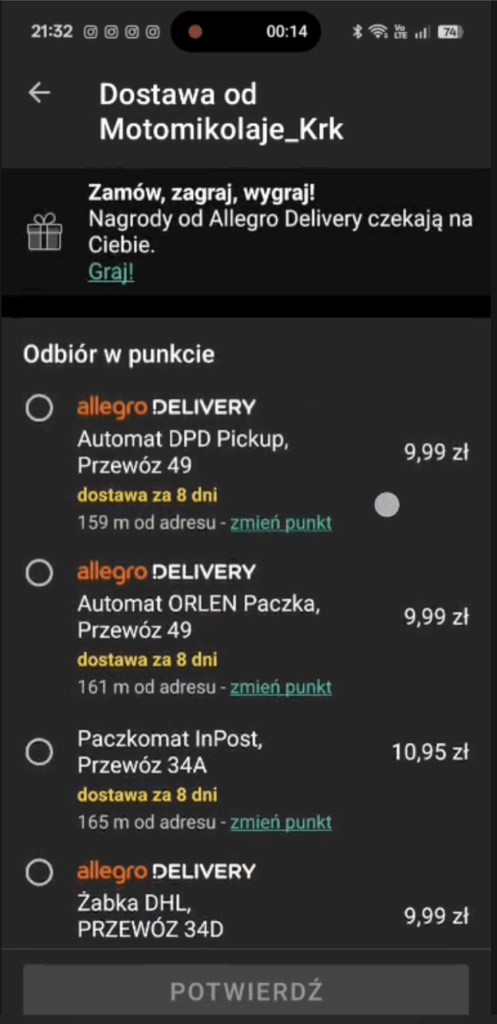 4. Pojawi się lista puntków Odbiór w punkcie. Przeskrolluj niżej: