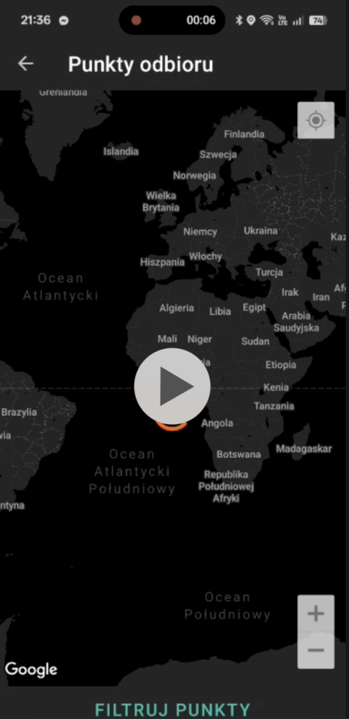 6. Pojawi się mapa z punktami. Najłatwiej kliknąć na dole w Filtruj Punkty