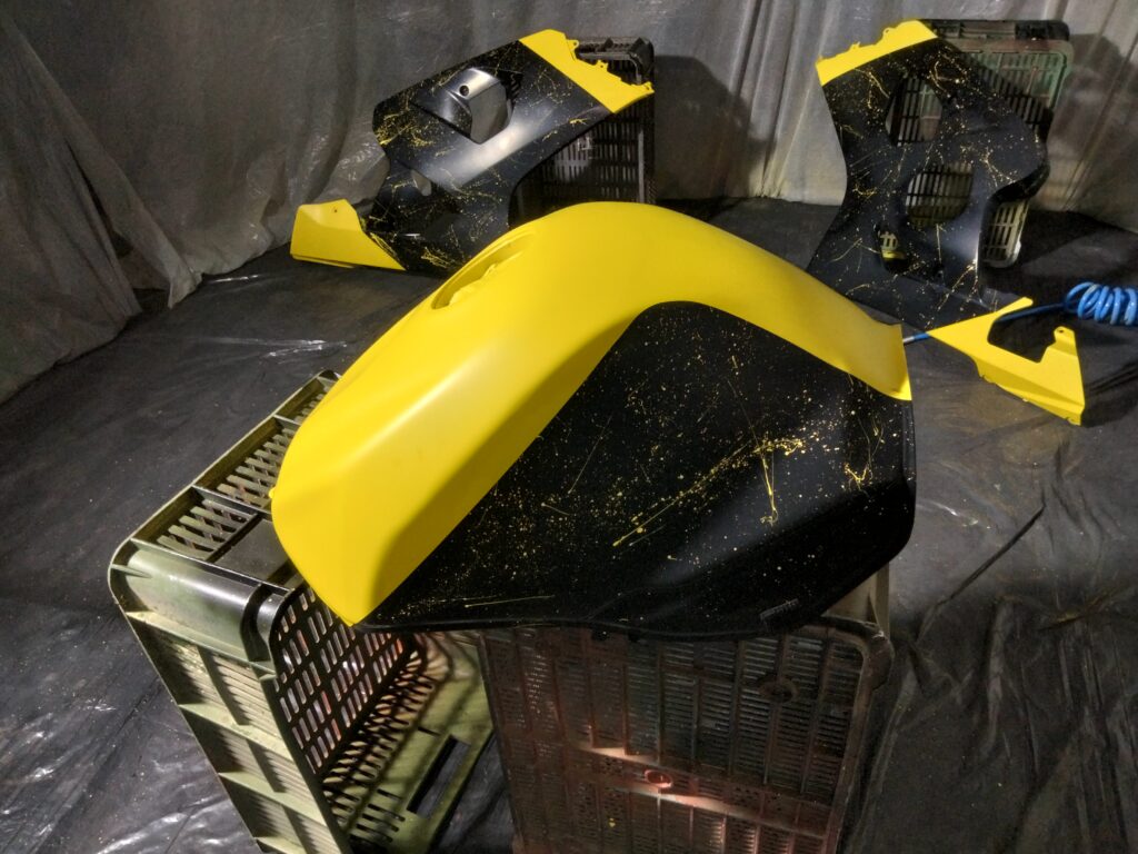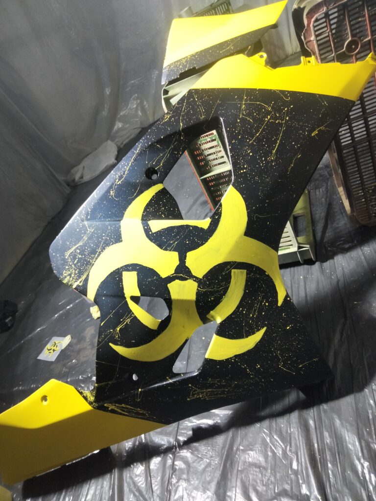 Po dwóch tygodniach rysowania, planowania, kombinowania – jest! Czarno-żółty, z ogromną grafiką biohazardu na bocznych owiewkach. Tak, to było to!