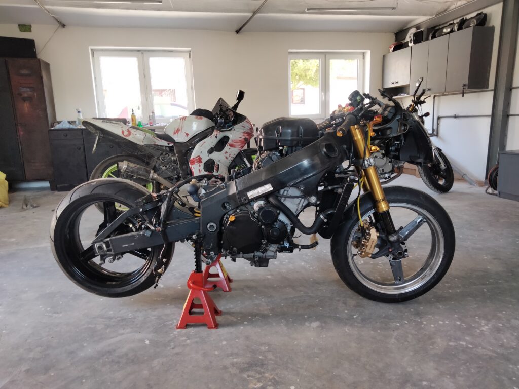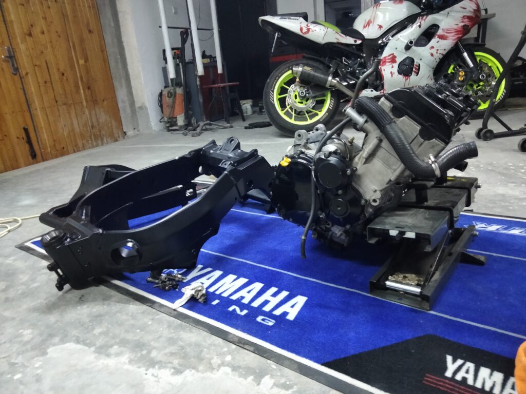 Składając to wszystko do kupy – nie byłam zadowolona. Połowa motocykla była już wymieniona, a z wahacza odchodził lakier, aluminium się utleniało… Długo się wahałam, ale w końcu stwierdziłam: dobra, wyciągamy silnik, lakierujemy ramę.